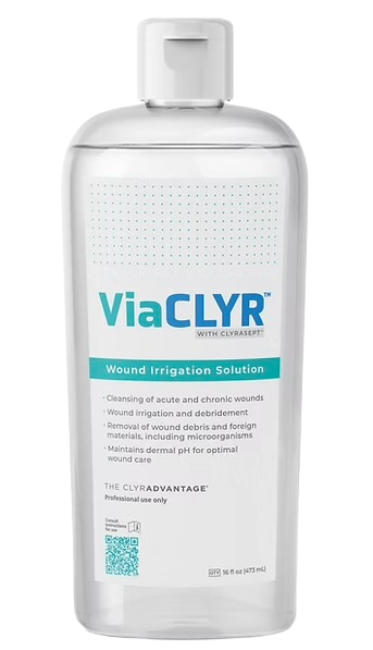 ViaCLYR is a highly effective, tissue safe, long-acting wound irrigation solution that can be used for acute and chronic wounds and burns, with no need to rinse out throughout the entire procedure.